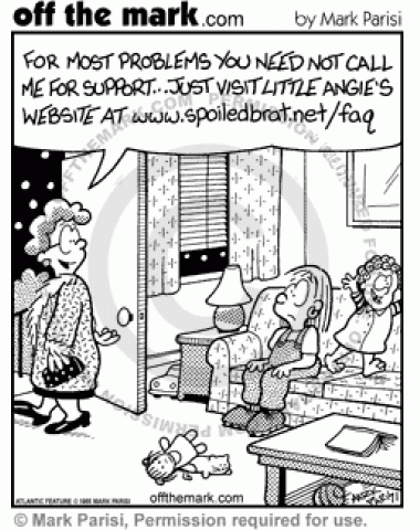 Babysitter FAQ A woman tells her babysitter that she doesn't need to call for help because her daughter's website spoiledbrat.com has the answers.