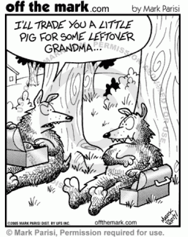 Wolves Trade Grandmother and Pig Lunches A wolf wants to trade his pig lunch for a fellow grandmother wolf's lunch.
