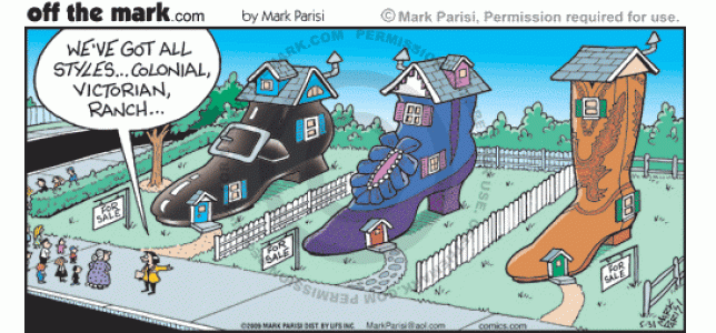 Shoe Houses Realtor brings old woman to Colonial, Victorian, and Ranch shoes.
