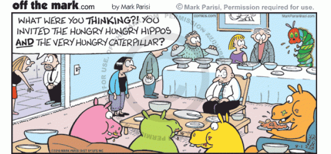 Hungry Hungry Guests Wife scolds husband for inviting hungry caterpillar and hippos as they ate all the food.