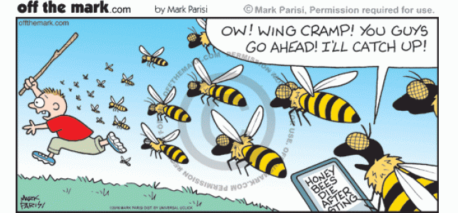 Honey bee fakes cramp after reading about dying after stinging someone.