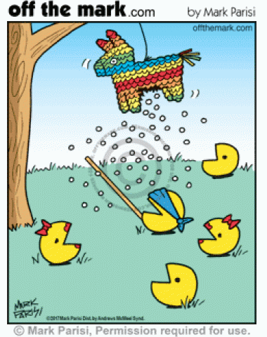 Pac Mans and Ms. Pac Mans catch Piñata treats with their mouths.