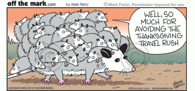 Opossum riding mom’s back with sibling crowd says so much for avoiding Thanksgiving travel rush.