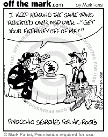 Pinocchio searches for his roots, but they turn out to be the stump he's sitting on.
