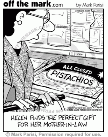 All Closed Pistachios Helen tries to annoy mother-in-law by buying her only sealed pistachios.