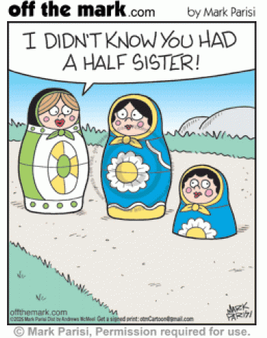 Matryoshka Doll’s Half Sister Russian nesting doll introduces top 1/2 body layer half-sister to surprised friend.