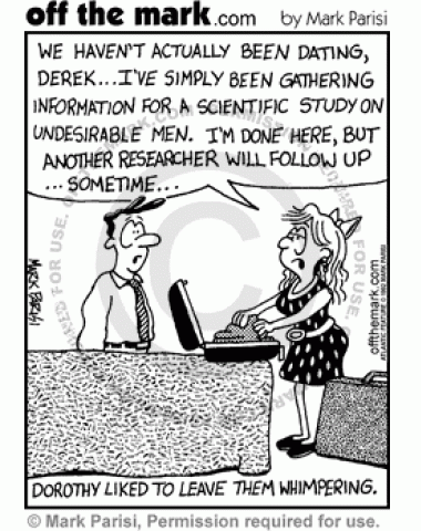 Scientific Research Dating Dorothy tells Dereck they haven't been dating, she's been researching a scientific study on undesirable men, she's done now, another researcher will follow up sometime.