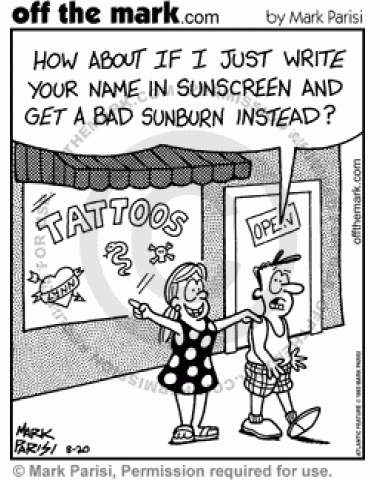 Tattoo Couple Commitment A woman wants her boyfriend to get a tattoo of her name, but he'd rather she wrote her name in sunscreen and he get a sunburn.