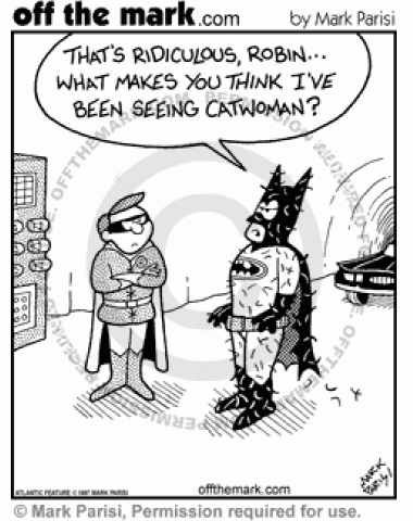 Batman Sees Catwoman Robin thinks Batman has been out to see Catwoman because he's covered in hair.