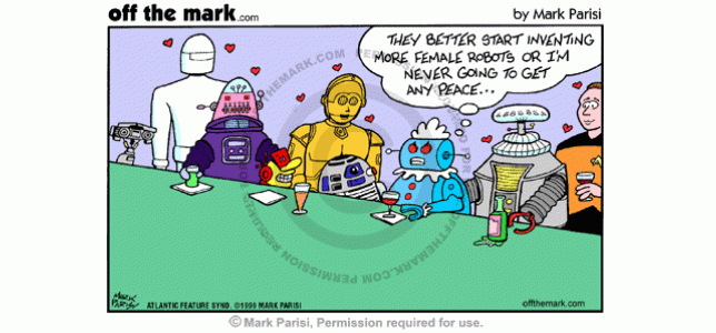 Female Robot Problems A female robot wishes they'd make more female robots so male robots would leave her alone.