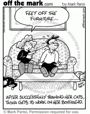 A woman trains her cats using a squirtgun, so she tries the same with her boyfriend.
