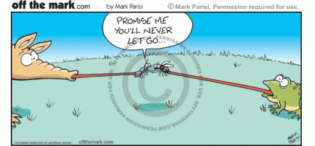 Ant and Fly Promise An ant stuck to an anteater's tongue and a fly stuck to a frog's tongue promise to never let go.