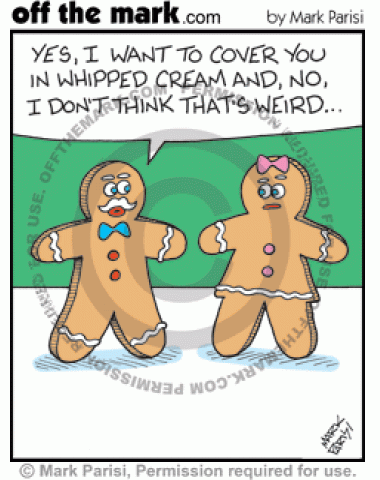 Gingerbread Whipped Cream A gingerbread man tells another gingerbread man that he wants to cover him in whipped cream.