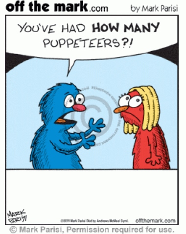 Sesame Street Muppet boyfriend is shocked by how many puppeteers puppet girlfriend has been with.