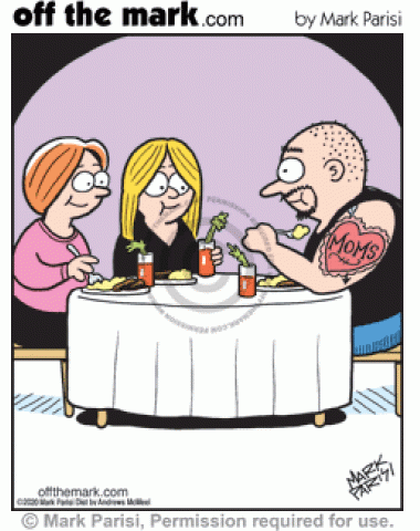 Tattooed Tough Guy Loves Two Moms Family Biker with moms heart tattoo has Mother’s Day brunch with two mothers same sex couple parents.