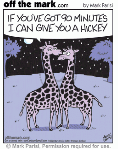 Long neck giraffe making out with date can give her a hickey if she has ninety minutes.