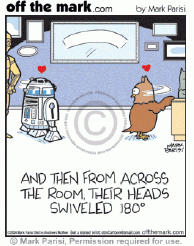 Star Wars R2D2 & Owl 180 Head Turn Romance Sci Fi movie droid R2-D2 & owl at bar fall in love swiveling heads 180 degrees.