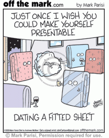 Neatly folded flat sheet at party wishes disheveled sheet lump date was more presentable.