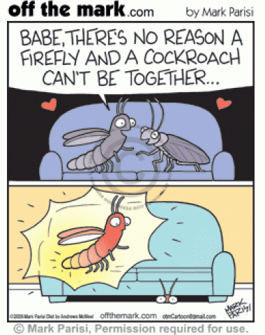 Firefly tells cockroach there’s no reason they can’t be together but flashing glow scares date hiding under couch.