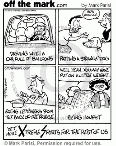 Extreme Sports for Everyone Regular people do extreme sports like driving with a car full of balloons and eating leftovers from the back of the fridge.