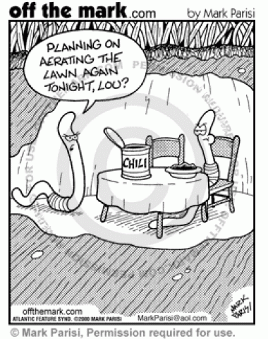 A worm eats chili and his wife asks if he's planning on aerating the lawn.