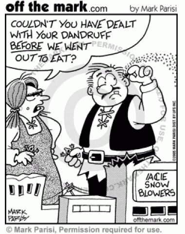 Giant with Dandruff A giant uses a snow blower to get rid of his dandruff.