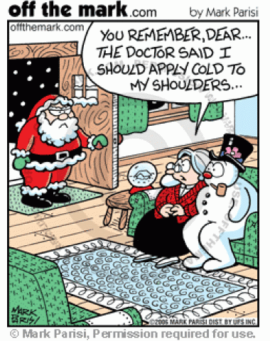 Mrs. Claus Applies Frosty Mrs. Claus tells Santa she is with Frosty because doctor told her to apply cold to shoulders.