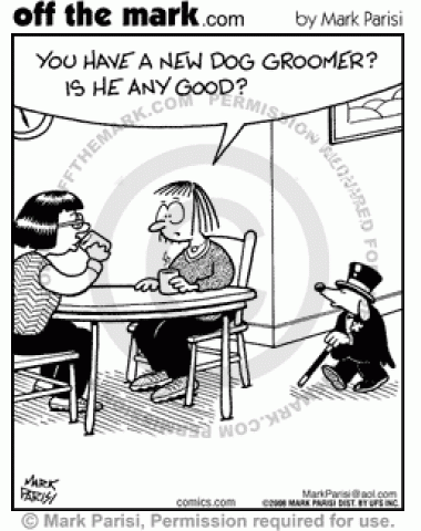 New Dog Groomer Owner has a new dog groomer and the dog is so well groomed he comes in groom attire.
