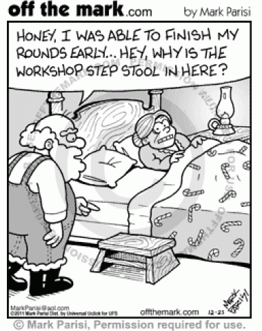 Workshop Step Stool Santa comes home early to be suspicious of elf step stool at Mrs. Claus's bedside.
