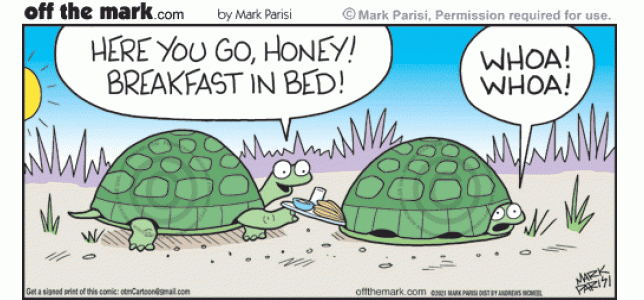 Wrong End Turtleshell Butt Breakfast In Bed Startles Turtle Husband Tortoise wife’s embarrassing rear end shell hole breakfast mix up shocks husband in rude awakening.