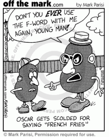 Potatohead Dirty Words Mr. Potatohead scolds son, Oscar, for using the f-word, Oscar had said French fries.