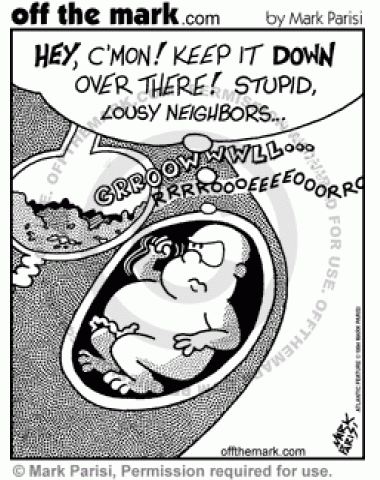 Fetus Noise Complaints A fetus smacks the side of the womb because its mom's stomach is growling too loudly.