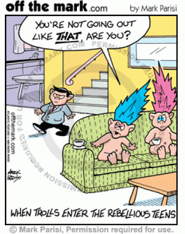 A Troll Doll slicks his hair down to be rebellious.