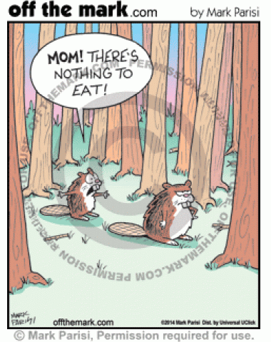 Nothing To Eat A beaver in a forest complains to his mom that there's nothing to eat.