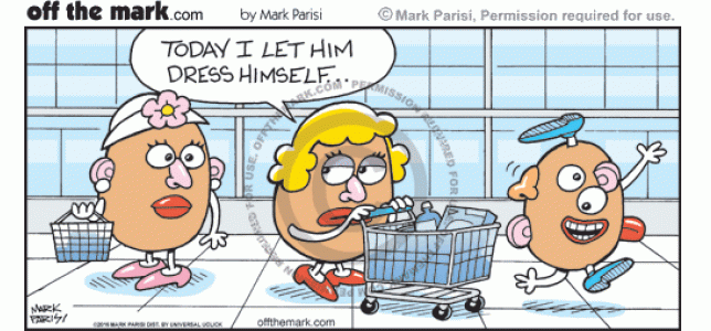 Mom explains that potatohead son's misplaced body parts are because he dressed himself.</p>