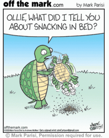Annoyed tortoise parent shaking crumbs out of son’s shell scolds him for snacking in bed.