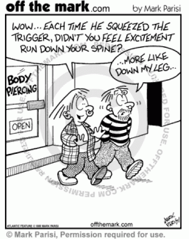 A woman says excitement ran through her spine when she got pierced, but a man says it ran down his leg.