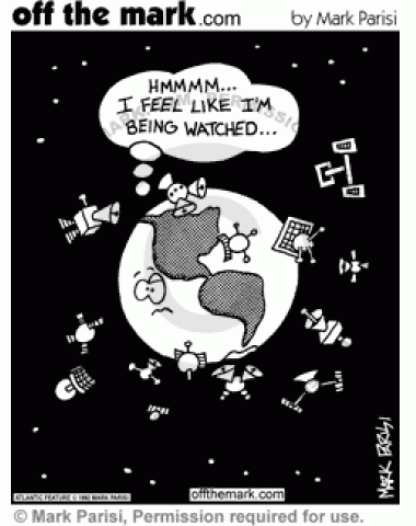 Spying Earth Satellites The Earth, surrounded by satellites in space, says that he feels like he's being watched.