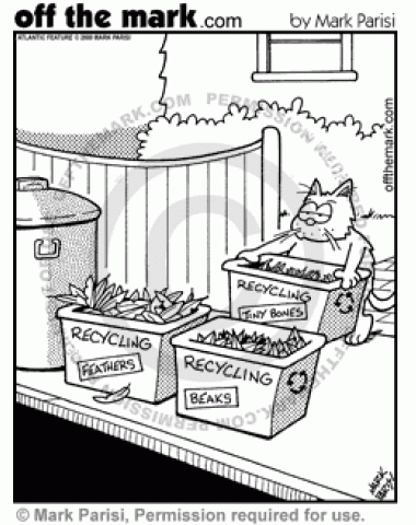 Cat Recycling Cat recycling has three bins: feathers, tiny bones, and beaks.