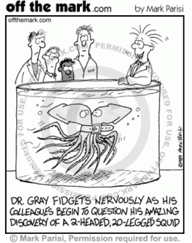 Colleagues doubt scientist's claim of discovering 2-headed squid since it's 2 squids and a belt.