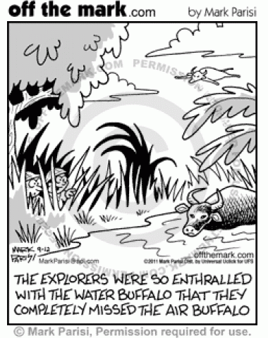 Explorers distracted by water buffalo overlook air buffalo above them.