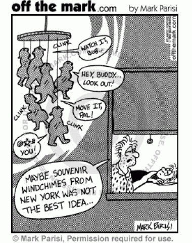 New York Wind Chimes Sleepy man tells wife souvenir wind chimes from New York wasn't the best idea because chimes are clinking and being rude to each other.