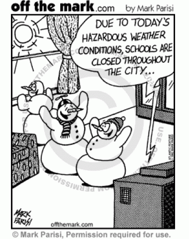 Snowmen School Closing Three snowmen in house, dad, mom, and child, are happy when the radio announces that schools are closed due to hazardous weather conditions.