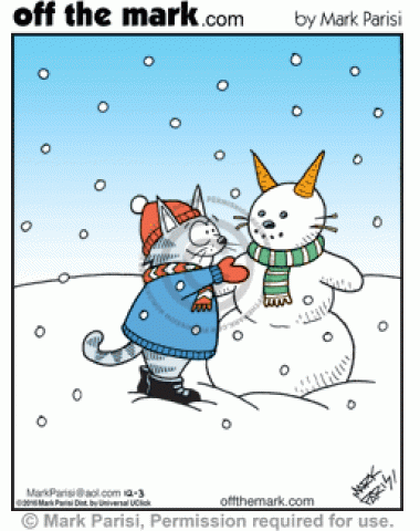 Cat makes snowman into a cat by putting carrots as ears.</p>