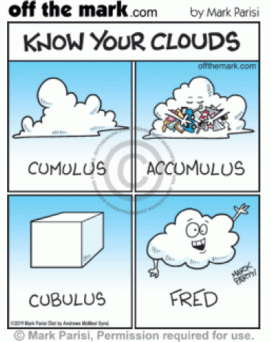 Identifying Clouds Guide identifying cumulus, cluttered accumulus, square cube cubulus and goofy waving Fred clouds.