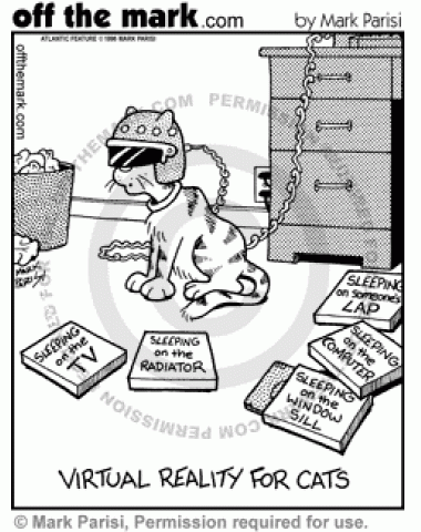 Cat Virtual Reality A cat uses a virtual reality simulator to play games that simulate sleeping in various places.