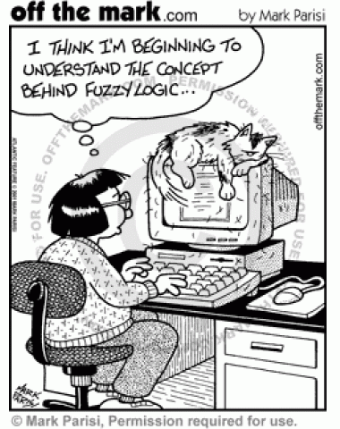A woman understands fuzzy logic when her computer gets covered in cat fur.