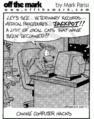 A pair of dogs use the computer to find out which local cats have been declawed.