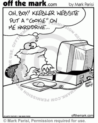 The Cookie Monster is excited when the Keebler website puts a cookie on his hard drive.