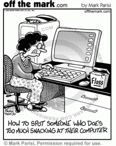 Flossing Snacks Keyboard A woman flosses her keyboard because she has too many crumbs from snacks in there.